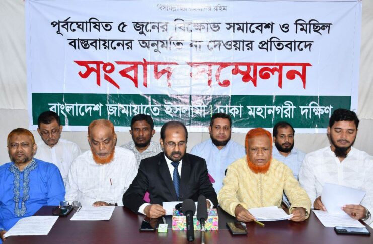 বাংলাদেশ জামায়াতে ইসলামী ঢাকা মহানগরী দক্ষিণের উদ্যোগে আজ ৫ জুন সকাল ১১ টায় রাজধানীর একটি মিলনায়তনে পূর্বঘোষিত ৫ জুনের বিক্ষোভ সমাবেশ ও মিছিল বাস্তবায়নের অনুমতি না দেওয়ার প্রতিবাদে সংবাদ সম্মেলন অনুষ্ঠিত হয়।
